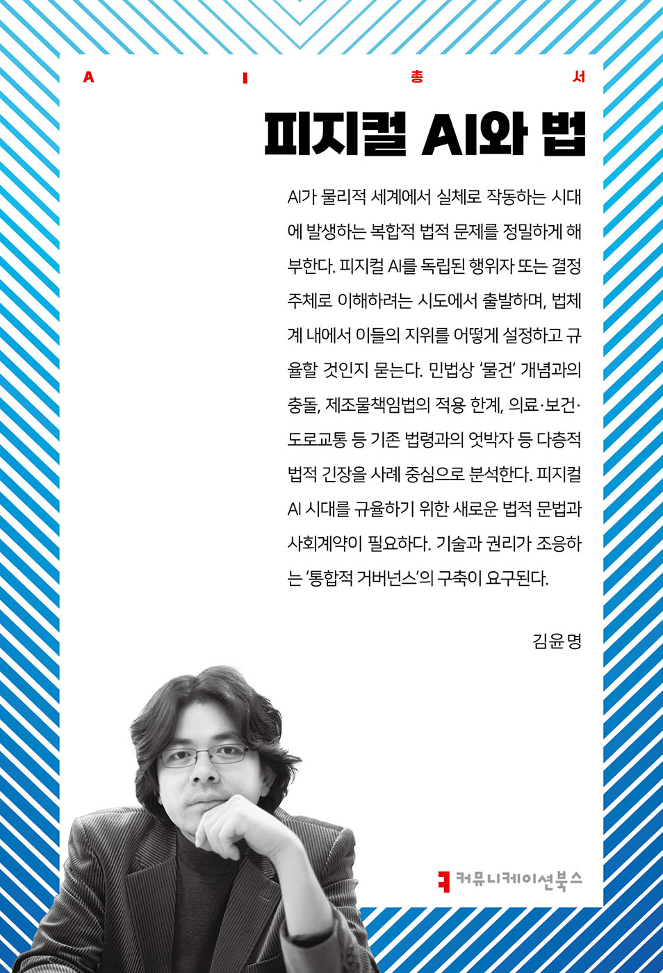 피지컬 AI는 이제 현실이다. 자율주행차와 돌봄 로봇, 드론이 인간과 함께 사회를 움직인다. 그러나 법은 여전히 이 존재들을 규정하지 못한다. 《피지컬 AI와 법》은 기술이 만든 법적 진공을 해부하며, 책임·권리·거버넌스를 새롭게 설계할 필요성을 제기한다. 기술을 제어하는 법이 아니라, 기술과 공존하는 법을 제안한다. 인공지능총서. aiseries.oopy.io에서 필요한 인공지능 지식을 찾을 수 있다.
