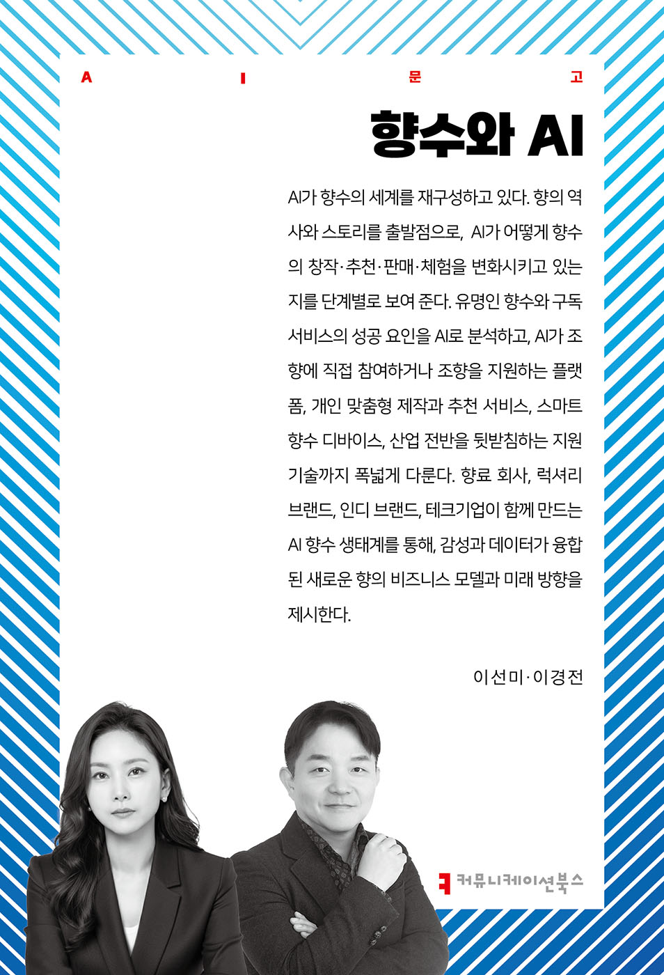 향수는 기억과 정체성을 설계해 온 감각의 예술이다. 이 책은 고대 제례의 연기에서 코코 샤넬의 혁신을 거쳐 AI 조향 플랫폼과 맞춤형 향수 비즈니스까지, 향기 산업의 변화를 조망한다. 감성과 알고리즘이 만나는 퍼퓸 테크의 현재와 미래를 제시한다. AI문고. aiseries.oopy.io에서 필요한 인공지능 지식을 찾을 수 있다.