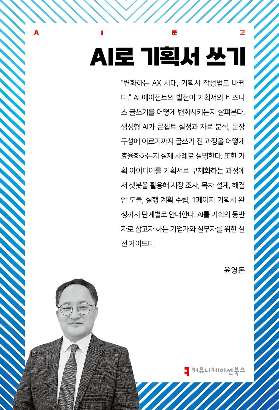 AI 에이전트 시대, 기획서는 혼자 쓰는 문서가 아니다. 이 책은 PDCA 전 과정을 기반으로 목표 설정부터 1페이지 요약까지 10단계 기획 흐름을 제시한다. 다양한 AI 도구를 연결해 초안을 만들고 다듬는 실전 전략을 담은 현장형 안내서다. AI문고. aiseries.oopy.io에서 필요한 인공지능 지식을 찾을 수 있다.