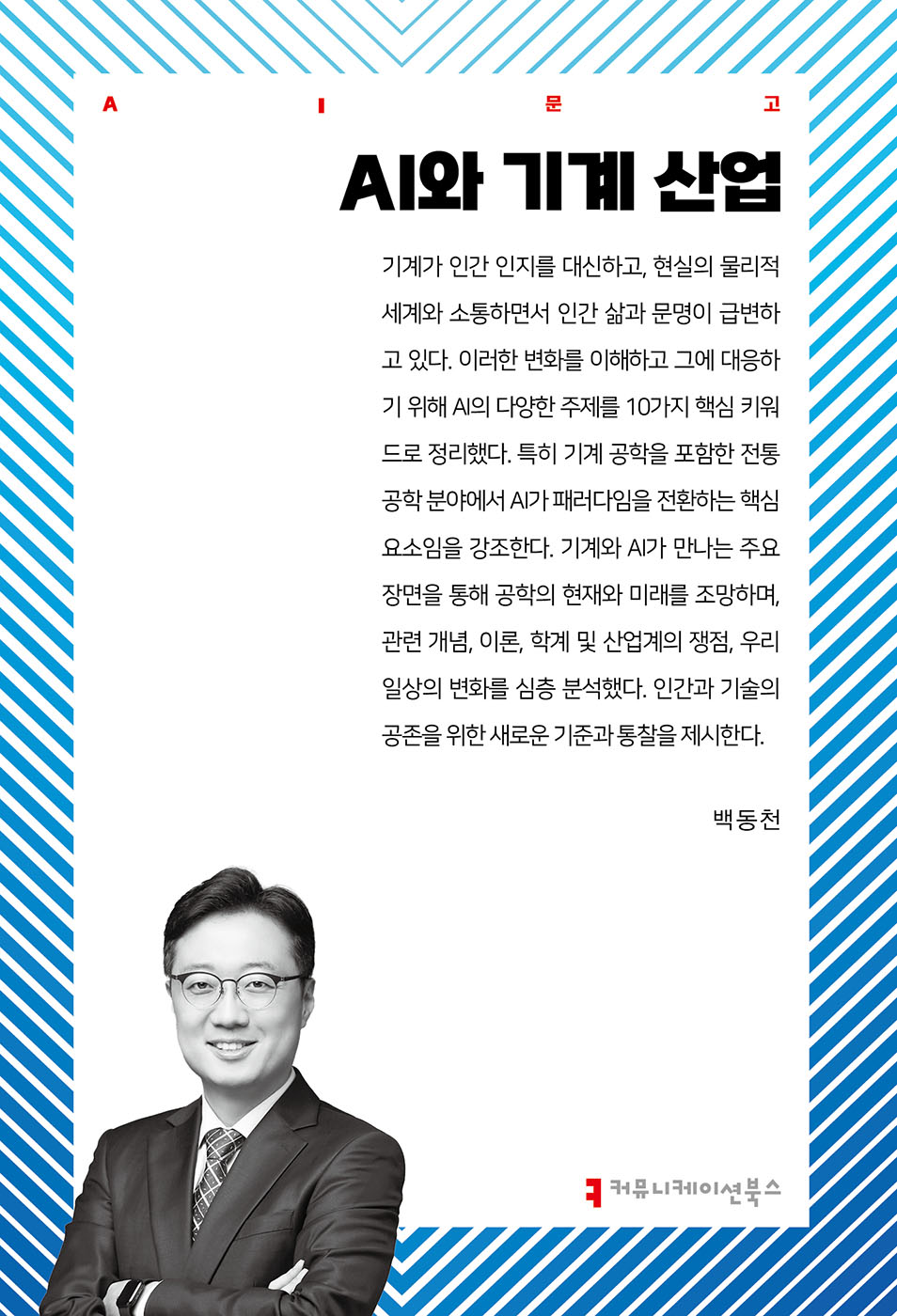 데이터 중심 공학, 자율 제조, AI 기반 설계를 통해 기계공학의 미래를 조망한다. 인공지능이라는 새로운 엔진이 어떻게 물리적 구현을 통해 산업과 사회를 바꾸는지 설명하며, 기계공학자의 역할 변화를 제시한다. AI문고. aiseries.oopy.io에서 필요한 인공지능 지식을 찾을 수 있다.