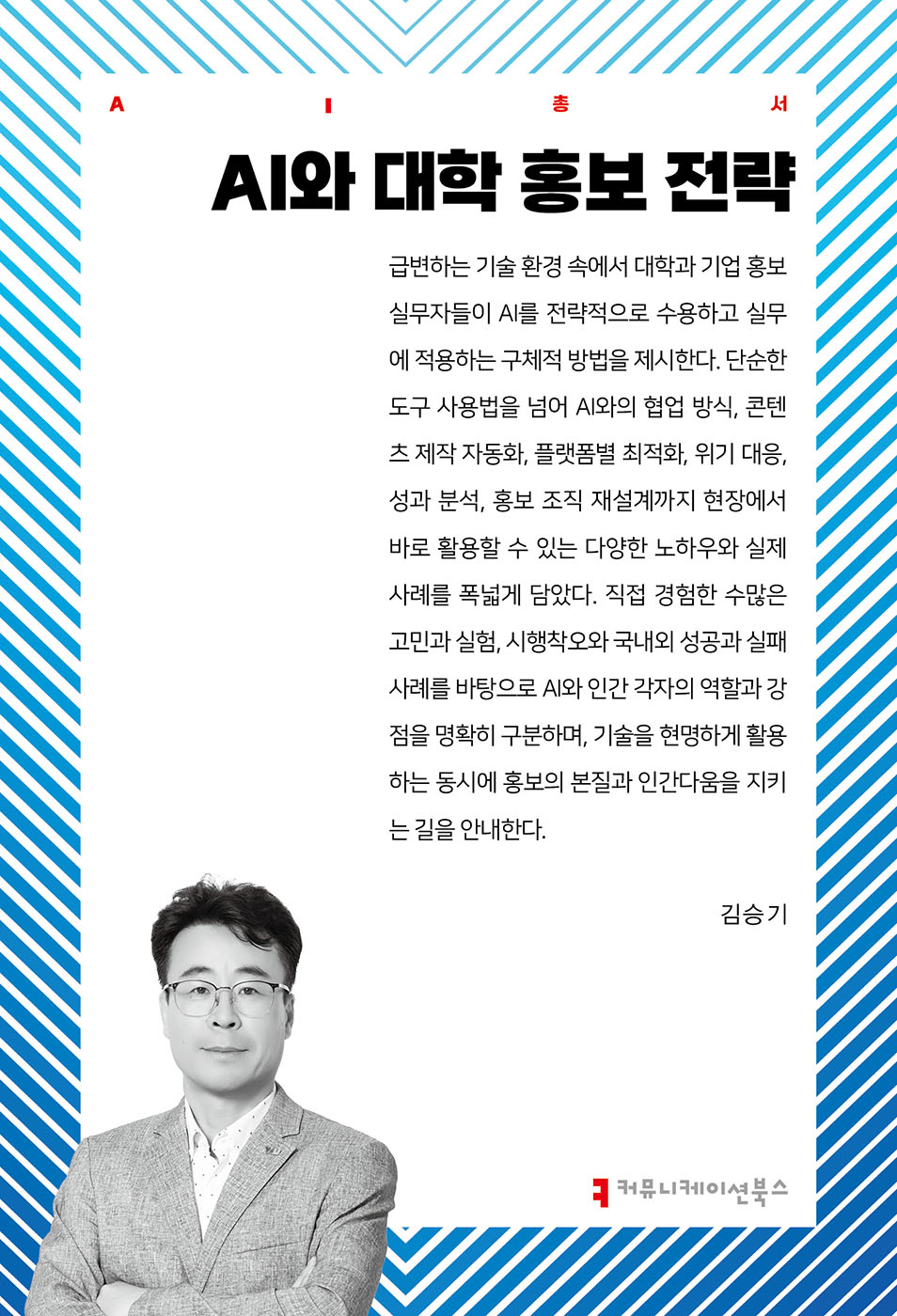 AI는 대학 홍보의 환경을 근본적으로 재편하고 있다. 생성형 AI가 대학 홍보 실무·조직·전략 전반을 어떻게 재편하는지 분석하고, 실무자가 갖춰야 할 다섯 가지 역량과 조직 전환의 핵심 방향을 제시한다. AI 시대, 대학 홍보팀이 변화 속에서 방향을 잃지 않도록 돕는 실전형 전략서다. AI총서. aiseries.oopy.io에서 필요한 인공지능 지식을 찾을 수 있다.